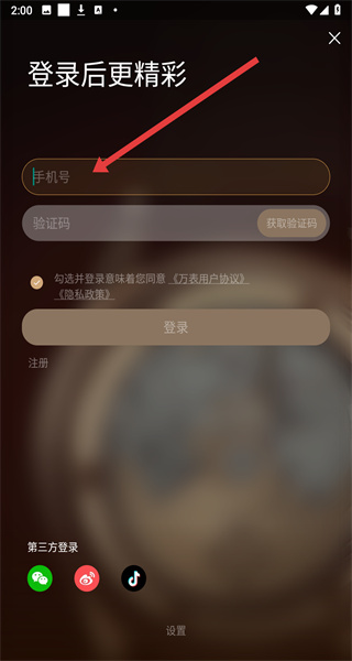 3、在勾选好同意按钮后,点击上方输入框填写手机号,以便获取验证码进行登录。