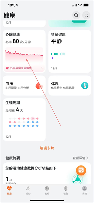1、在华为运动健康的健康页面,点击心脏健康区域,进入心脏健康详情页。