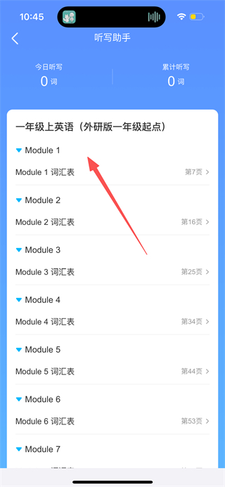 2、在听写助手页面,点击目标模块,进入该模块词汇表页面。