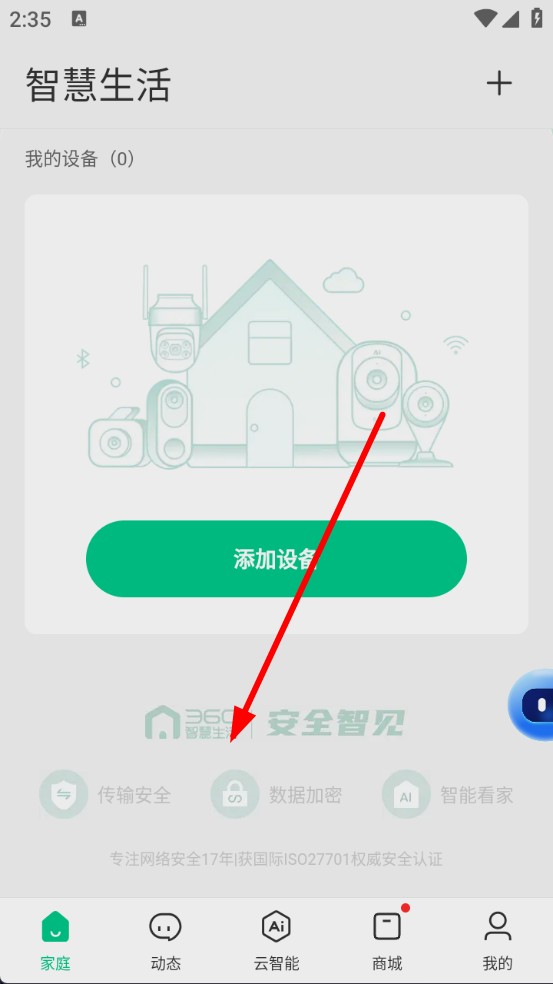 1、打开360智慧生活APP,进入底部导航栏的家庭页面。