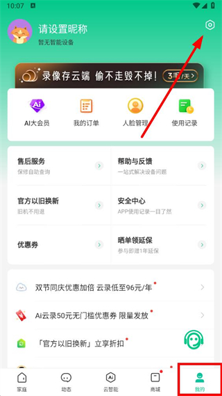 1、打开360智慧生活app,进入我的页面后点击右上角设置图标,进入设置界面。