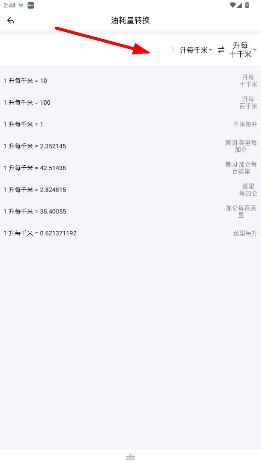 3、进入油耗量转换页面后,点击右侧单位选择区域,挑选所需的油耗单位。