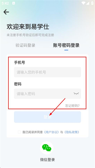 4、在账号密码登录页面,填写手机号与密码,点击登录,完成账号登录。