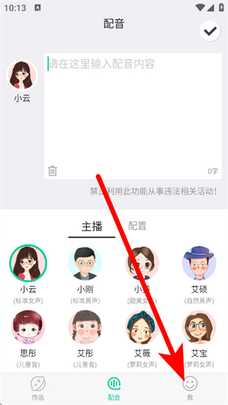 1、打开配音全能王,点击底部的我,进入个人页面。