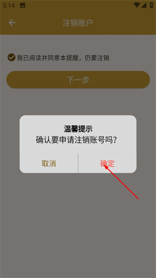 5、在温馨提示弹窗中,点击确定按钮,完成注销账号操作。