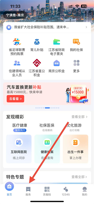 1、打开苏服办APP,点击底部服务选项进入服务页面。