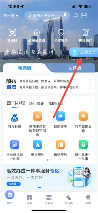 1、在苏服办app首页,点击立即登录,进入登录页面。