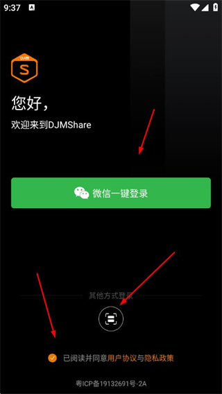 1、打开DJMShare APP,勾选协议,可选择微信一键登录,或者点击其他方式登录。