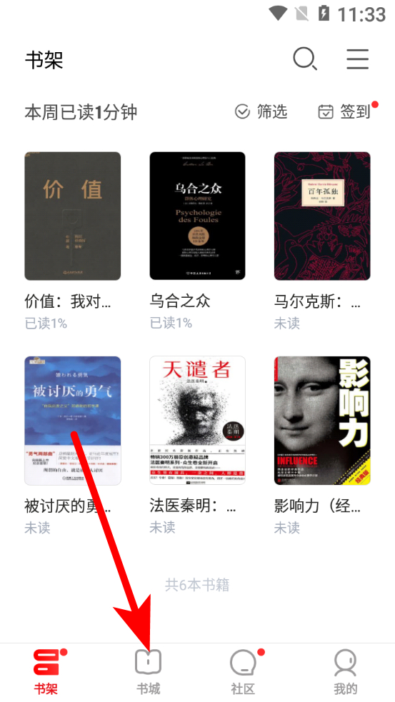1、在京东读书书架页面,点击下方书城选项,进入书城页面。