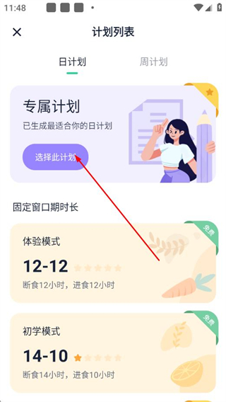 1、在辟谷轻断食app的选择计划页面,点击选择计划,进入计划列表页面。
