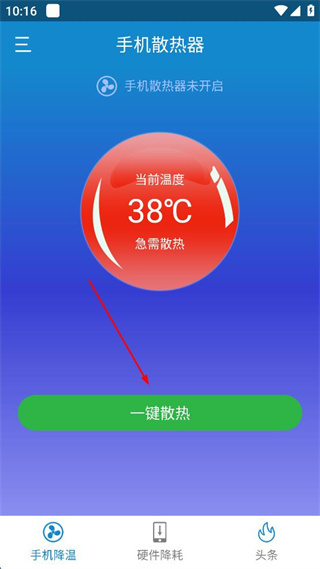 1、在手机散热器应用主界面,查看当前温度显示,点击“一键散热”按钮启动散热程序。