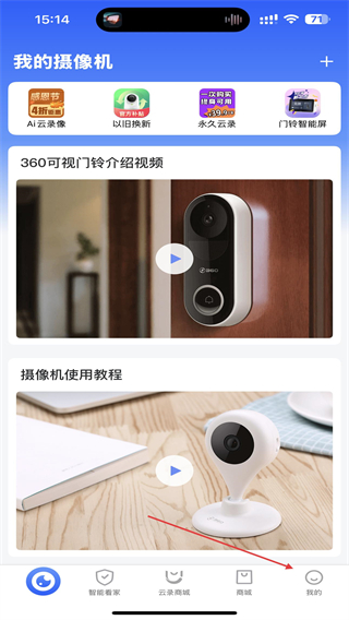 1、打开360智能摄像机App,点击底部导航栏右下角的我的选项。