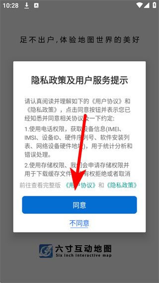 1、打开六寸互动地图,在弹出的弹窗中,阅读相关内容后点击同意,进入APP主界面。