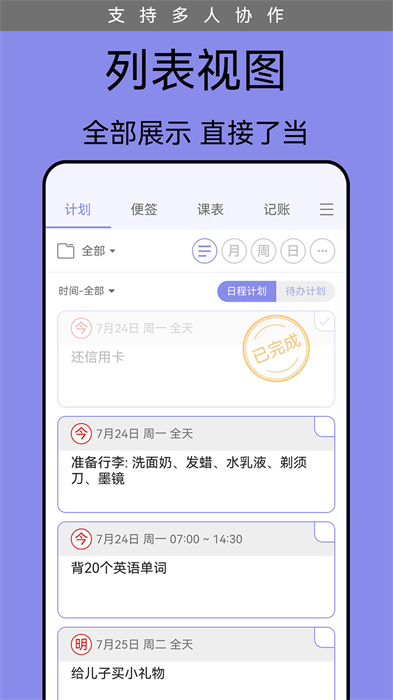 4.任务计划共享协作:与家人、好友和同事共享任务清单,多人协同完成任务日程安排,更能监督您的任务执行或习惯打卡情况