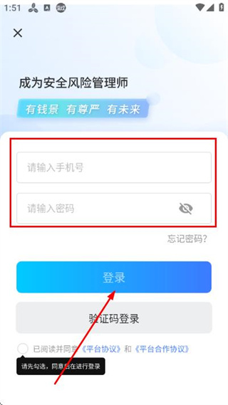 3、在登录页面填写手机号和密码,勾选协议后,点击登录完成账号登录操作。