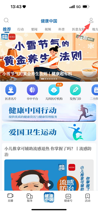 2、在健康中国首页,点击右上角的头像图标,进入个人中心页面。