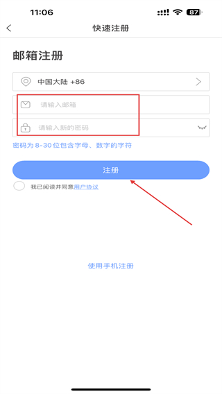 3、输入邮箱、密码后,点击注册的按钮即可完成。