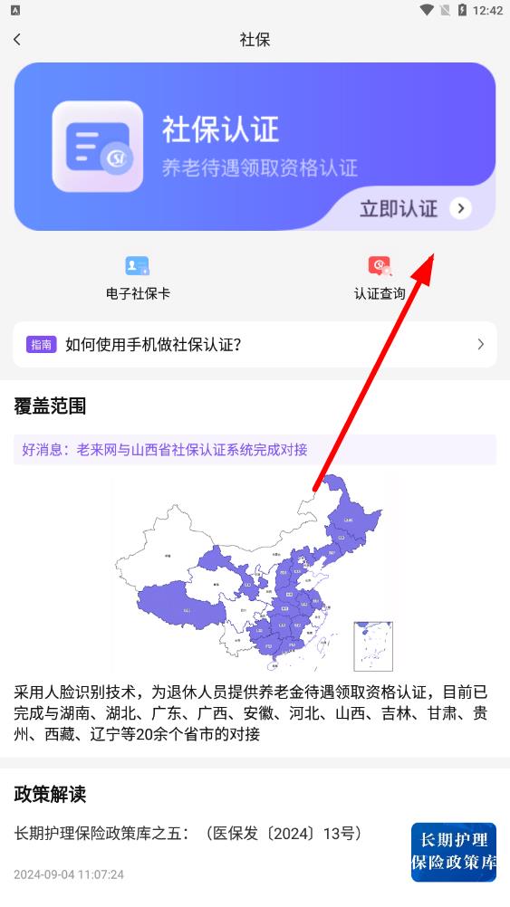 2、社保认证板块醒目,含养老待遇领取资格认证功能,点击立即认证即可操作,采用人脸识别,还设政策解读栏,助力退休人员便捷完成社保认证。