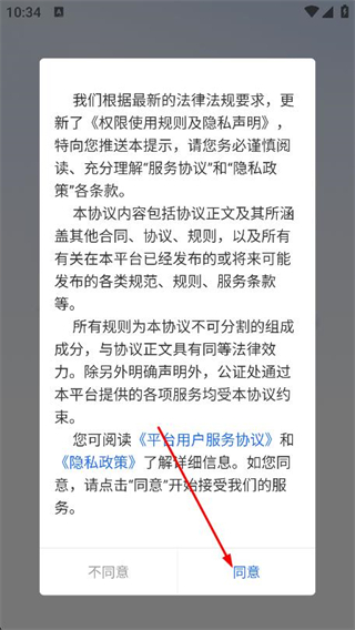 1、打开公证云app,在弹出隐私政策界面,点击同意。