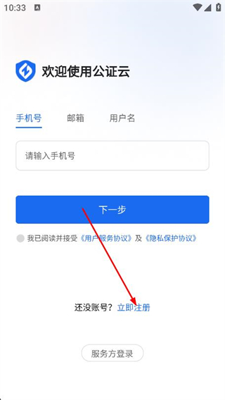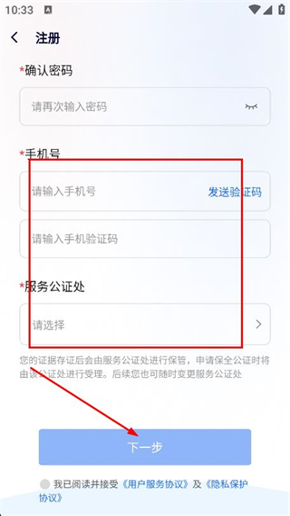 4、输入手机号和验证码,选择服务公证处,点击下一步,即可完成账号注册。
