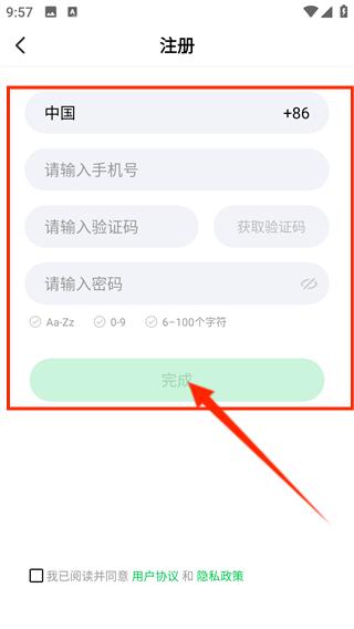 4、输入手机号、验证码和密码后,点击完成,进行注册操作。