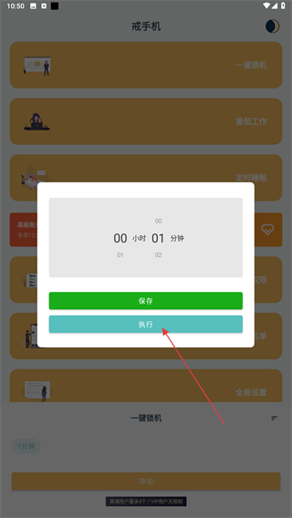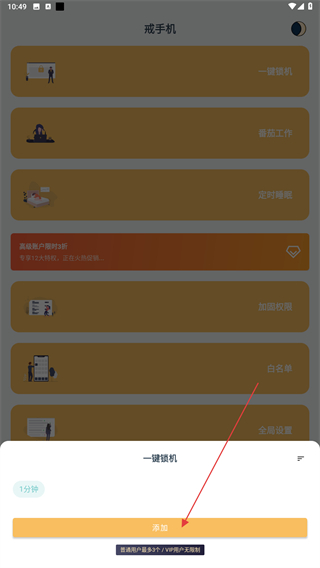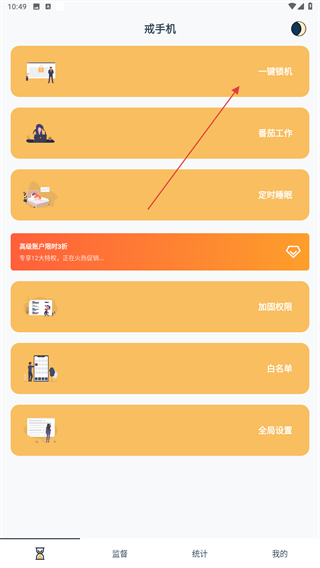 1、打开戒手机app,进入到首页内点击一键锁机的按钮。
