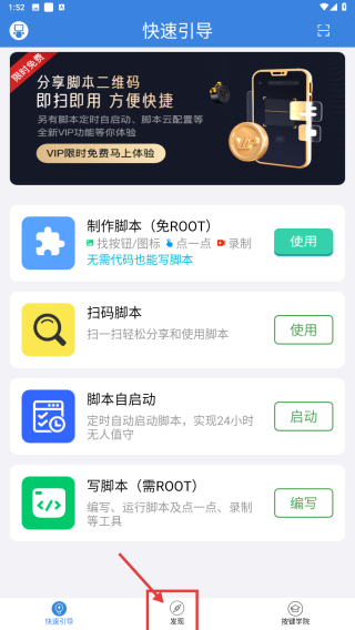 1、打开脚本工具类应用,点击底部发现选项,进入发现页面。