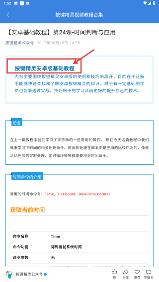 4、在教程详情页,查看关于按键精灵安卓版时间判断命令的专业讲解,内容涵盖Time命令获取当前系统时间等时间判断相关知识及应用。