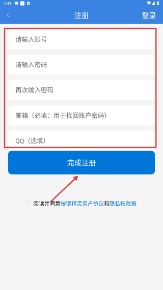 4、在注册页面,依次填写账号、密码、再次输入密码、邮箱点击完成注册按钮,完成账号注册操作。