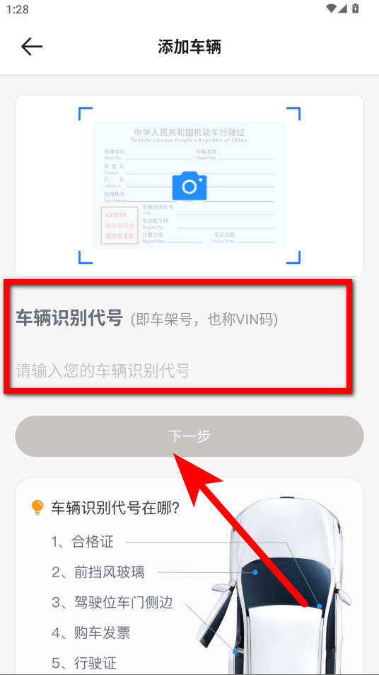 3、点击添加车辆,输入车辆识别代号,点击下一步,完成后续车辆添加操作。