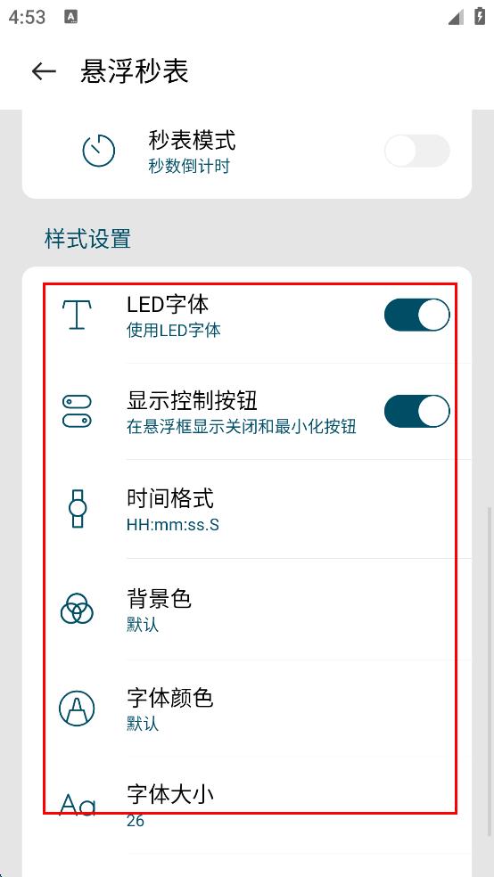 4、开启悬浮后,在悬浮秒表设置页面,对LED字体、显示控制按钮、时间格式等样式进行设置即可。