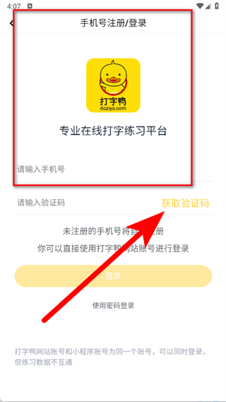 3、在手机号注册登录页面输入手机号,点击获取验证码。