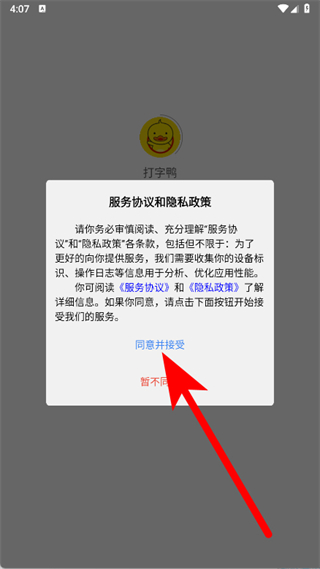 1、打开打字鸭APP,在弹窗中点击同意并接受。
