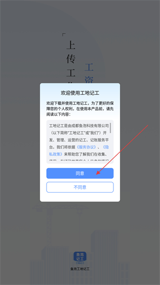 1、打开鱼泡工地记工APP,进入时会跳出服务协议、隐私政策,点击同意的按钮。