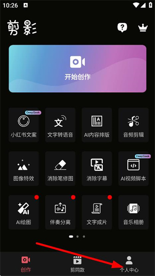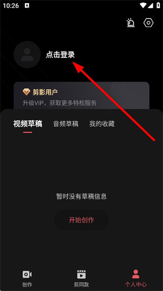 1、在剪影软件主界面,点击右下角的个人中心,进入页面。