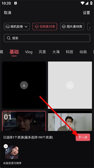 3、在素材选择页面,选择要编辑的视频素材后,点击下一步,进入视频编辑页面。