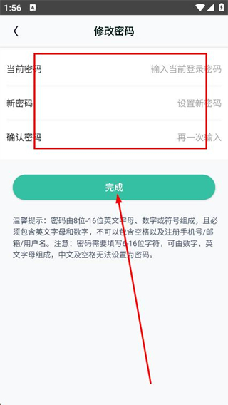 4、根据提示设置密码,点击完成按钮即可修改密码。