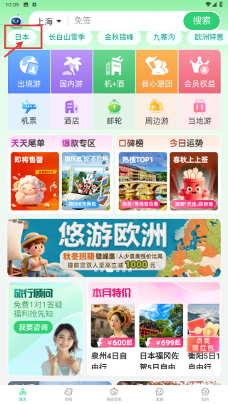 1、打开旅游服务类应用,点击日本目的地分类,进入日本旅游产品页面。