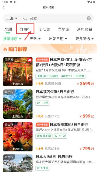 2、在日本旅游产品页面,选择自由行分类,进入自由行产品列表页面。