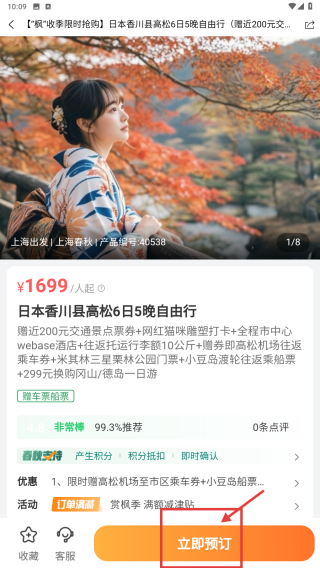 4、在详情页面,点击立即预订按钮,进行旅游产品预订操作。