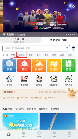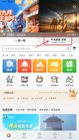 1、打开旅游服务类应用,点击私家团·定制分类,进入定制游页面。