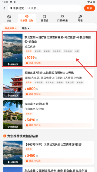 2、在定制游页面,选择长白山目的地,进入该目的地的旅游产品列表页面。