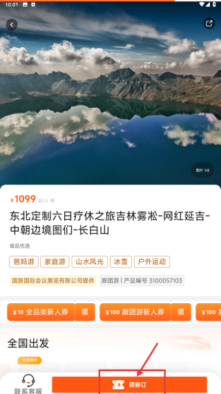 3、选择东北定制六日疗休之旅吉林雾凇-网红延吉-中朝边境图们-长白山旅游产品条目,进入产品详情页面。