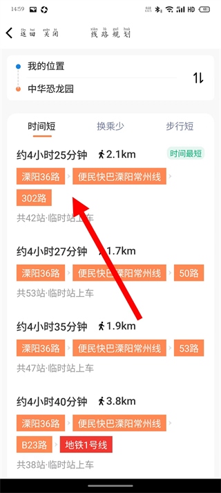4、点击方案查看详细的公交换乘站点、首末班车时间及步行指引等信息。