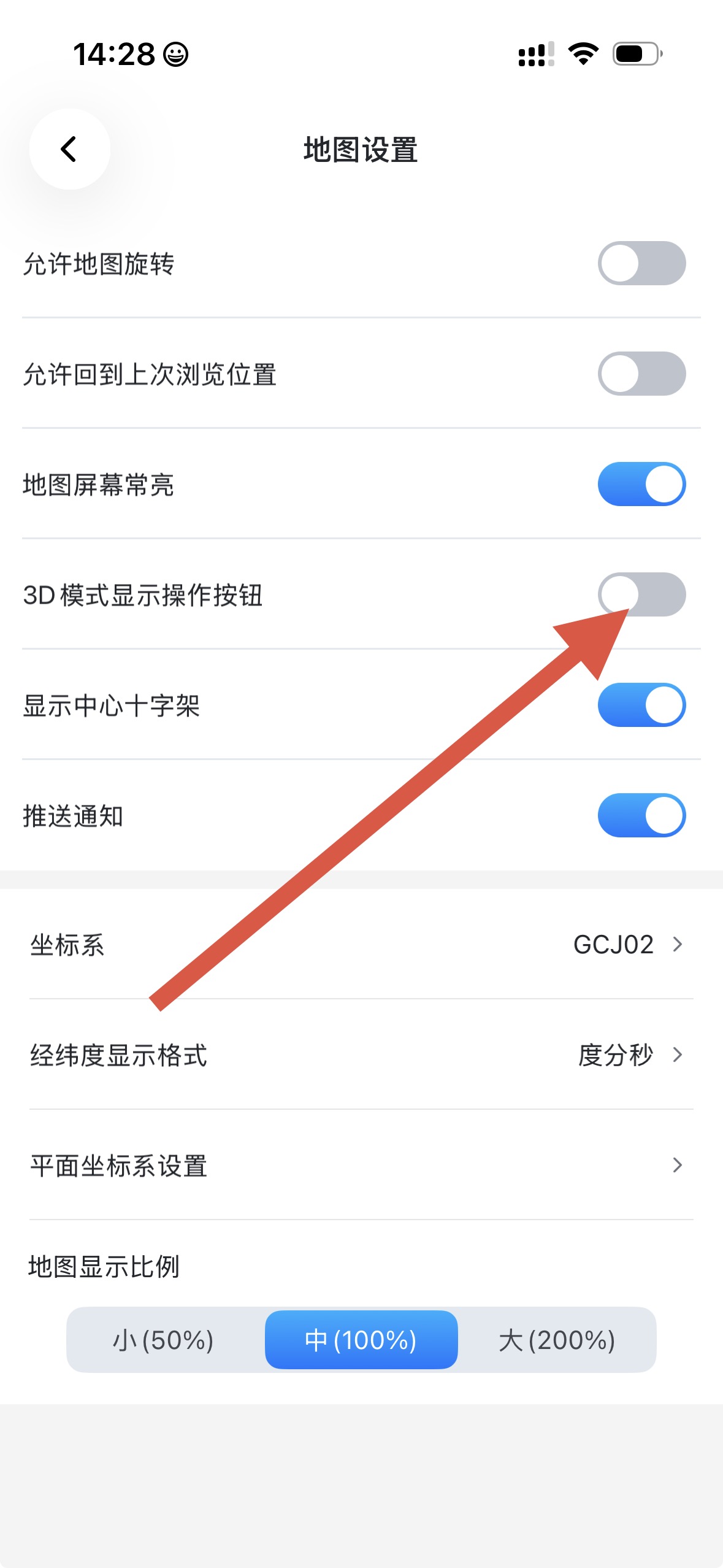 4、在地图设置页面,找到3D模式显示操作按钮选项,点击开启其开关,即可启用3D模式显示操作按钮。