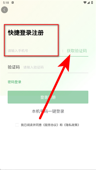 3、在快捷登录注册页面,输入手机号,点击获取验证码。