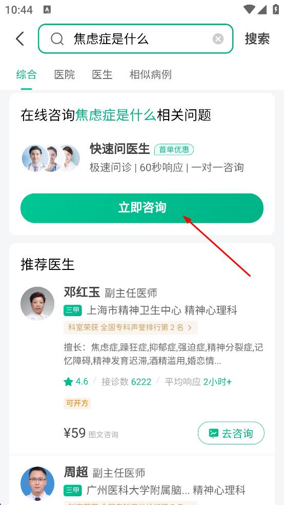 4、在搜索结果页面,可点击立即咨询,进行在线咨询,也可选择推荐医生进行咨询。