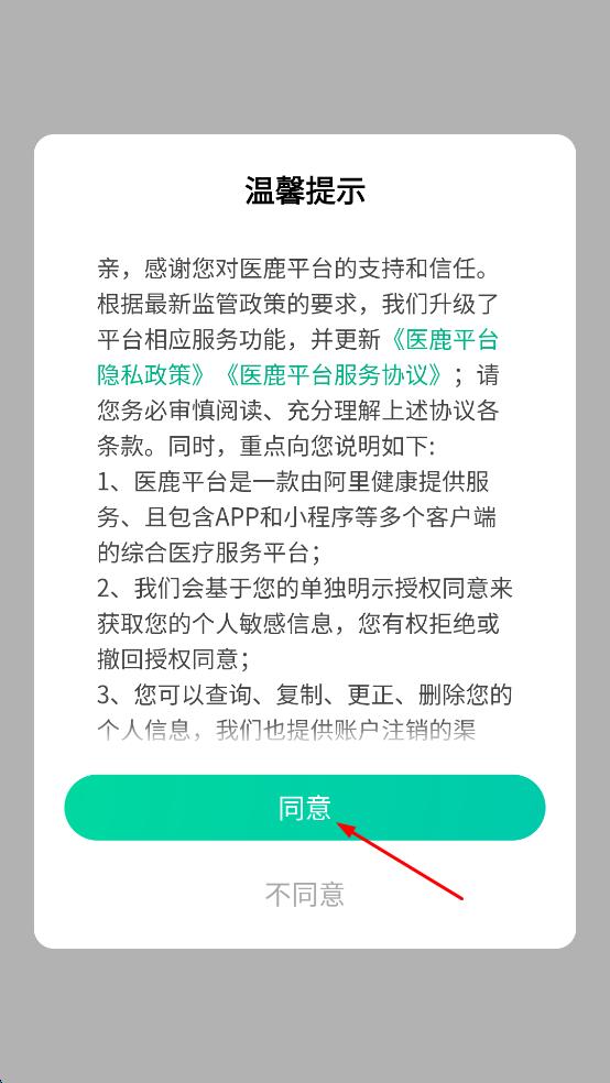 1、打开医鹿平台,在弹出的温馨提示页面,点击同意,进入医鹿平台首页。