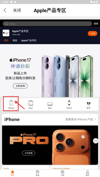 3、在Apple产品专区,点击iPhone分类,查看iPhone系列产品。