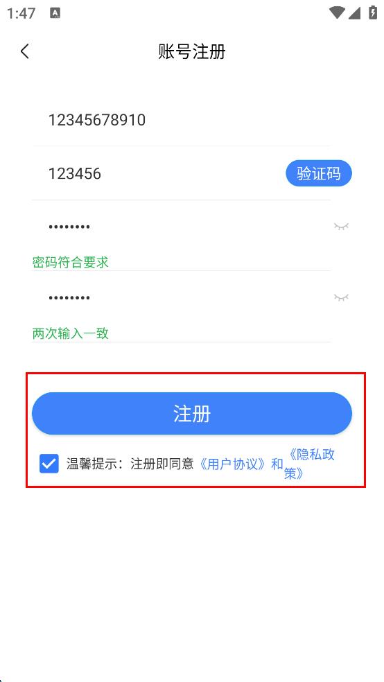 4、勾选注册即同意相关协议和政策,点击注册,即可完成e会学的账号注册。